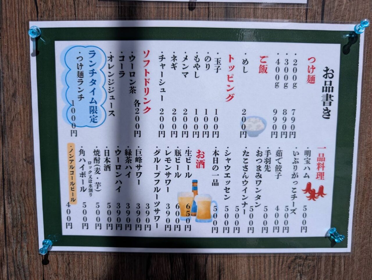 気になるメニューはこちら。メインのつけ麺はもちろん、気になるのは一品料理。そこで、昼間ではありましたが、一杯、いただくことにしました。なお、本日の一品は夜の部のみとのことですので、ご注意を。