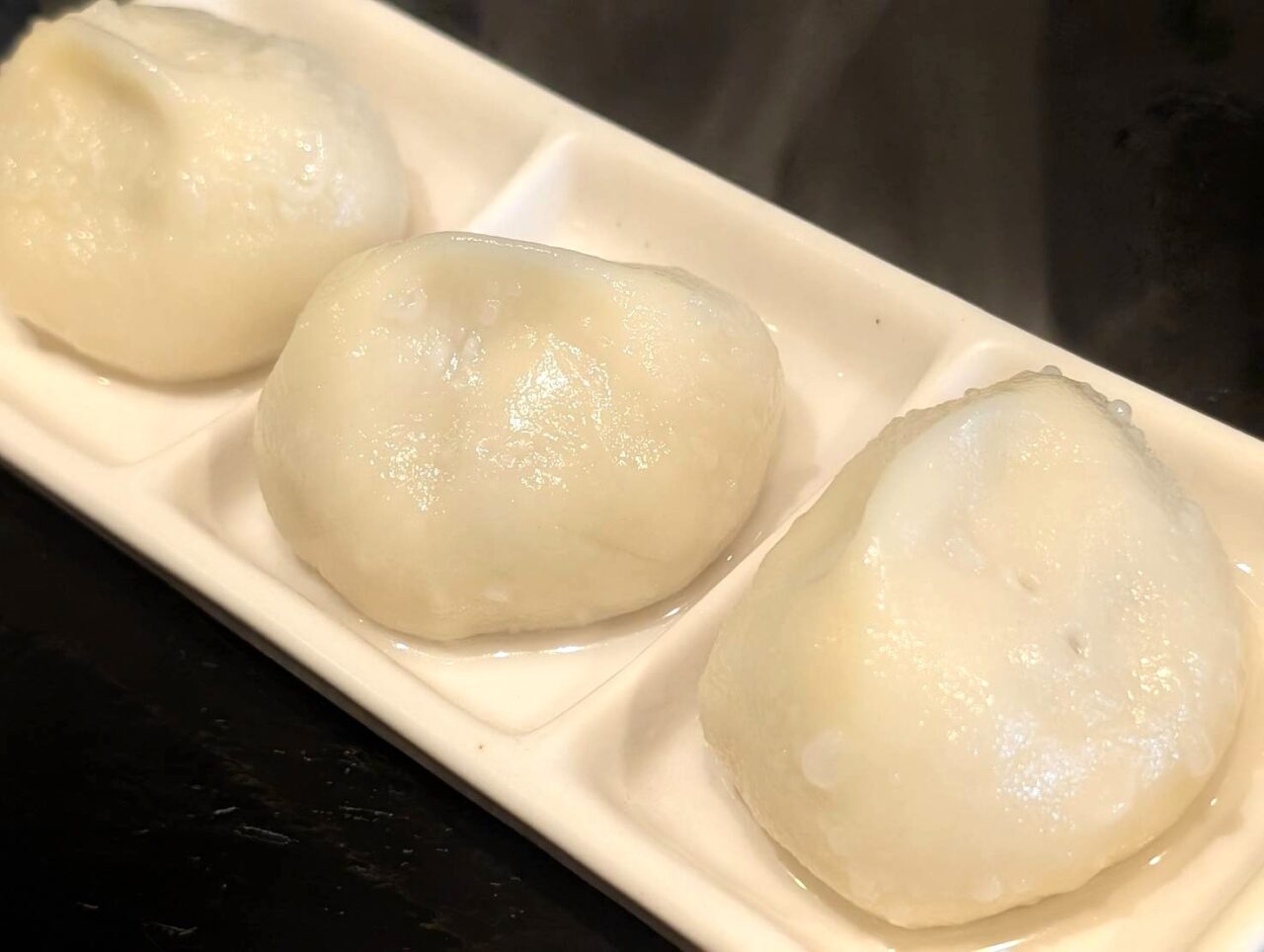 茹で餃子は、丸いモチモチタイプ。割れば、中から肉汁が溢れます。お味濃いめなので、そのままでも美味しくいただけます。