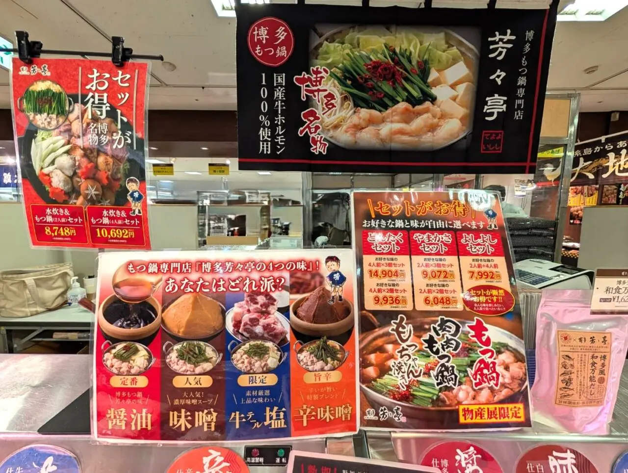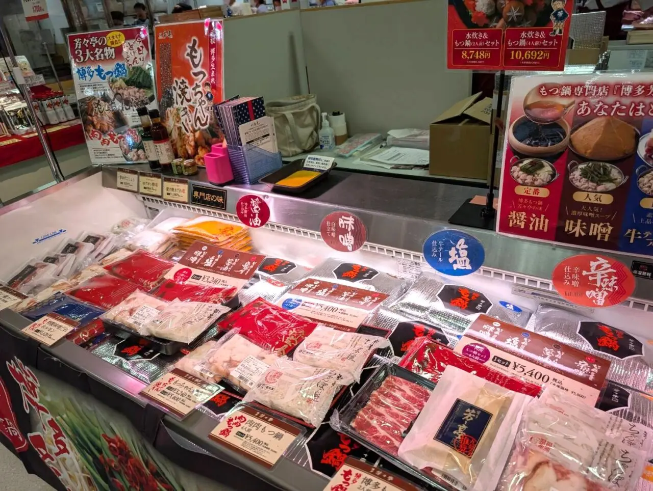 お店には、醤油、味噌、塩、辛味噌の4種類を販売。中には、生モツ、スープ、ちゃんぽん麺が入っているので、お好みのお野菜を用意するだけで、本場のもつ鍋がご自宅でいただけちゃいます。