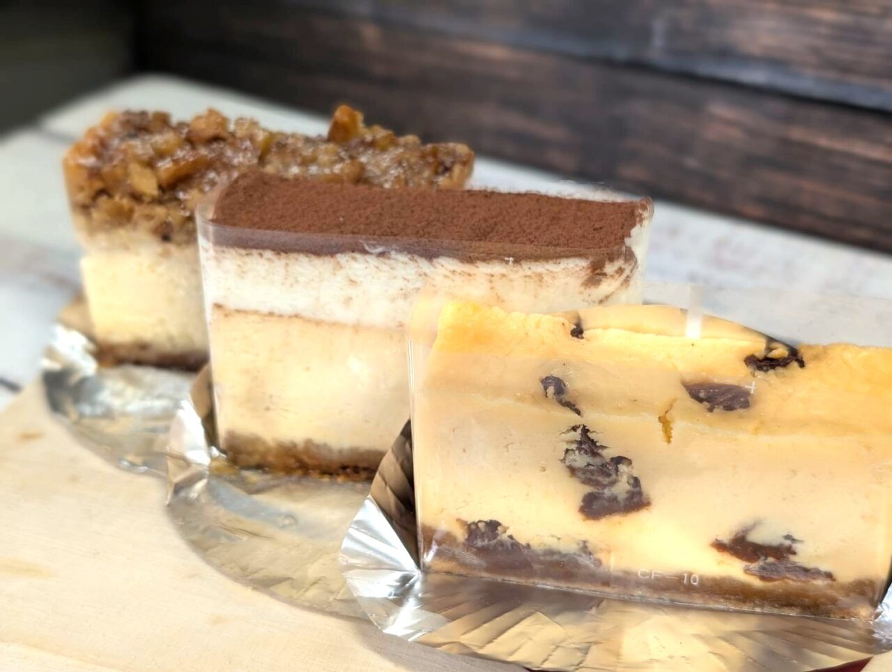 私が購入したのは、奥からキャラメルナッツチーズケーキ、ティラミスチーズケーキ、ラムレーズンチーズケーキ。どれも、濃厚なクリームチーズのコクとまろやかな酸味。そして上品な甘さが後を引く逸品です。