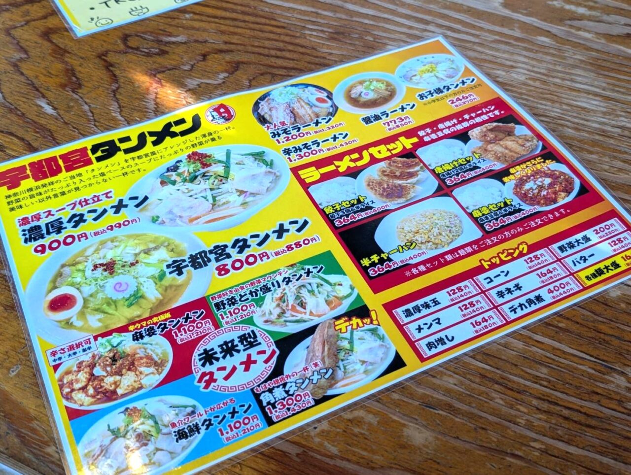 横浜発祥のタンメンを宇都宮風にアレンジしたラーメンが看板のこちらのお店、メニューには、様々なタンメンが並びます。その他のメニューはお店にてご確認ください。