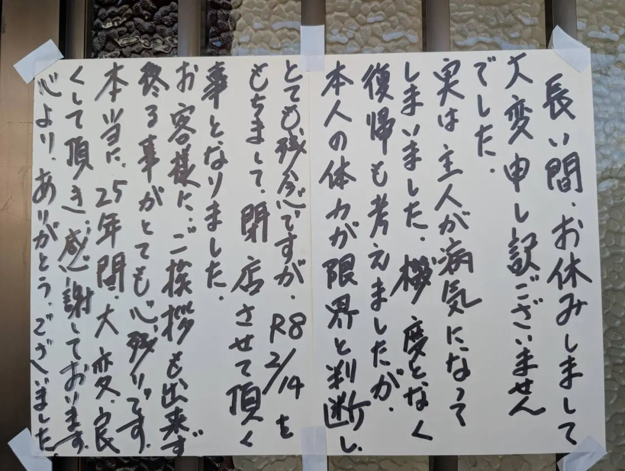 お店に到着すると、入口にお知らせがありました。こちらによると、お店の方の体調不良により、2026年2月14日(金)に閉店するとのこと。