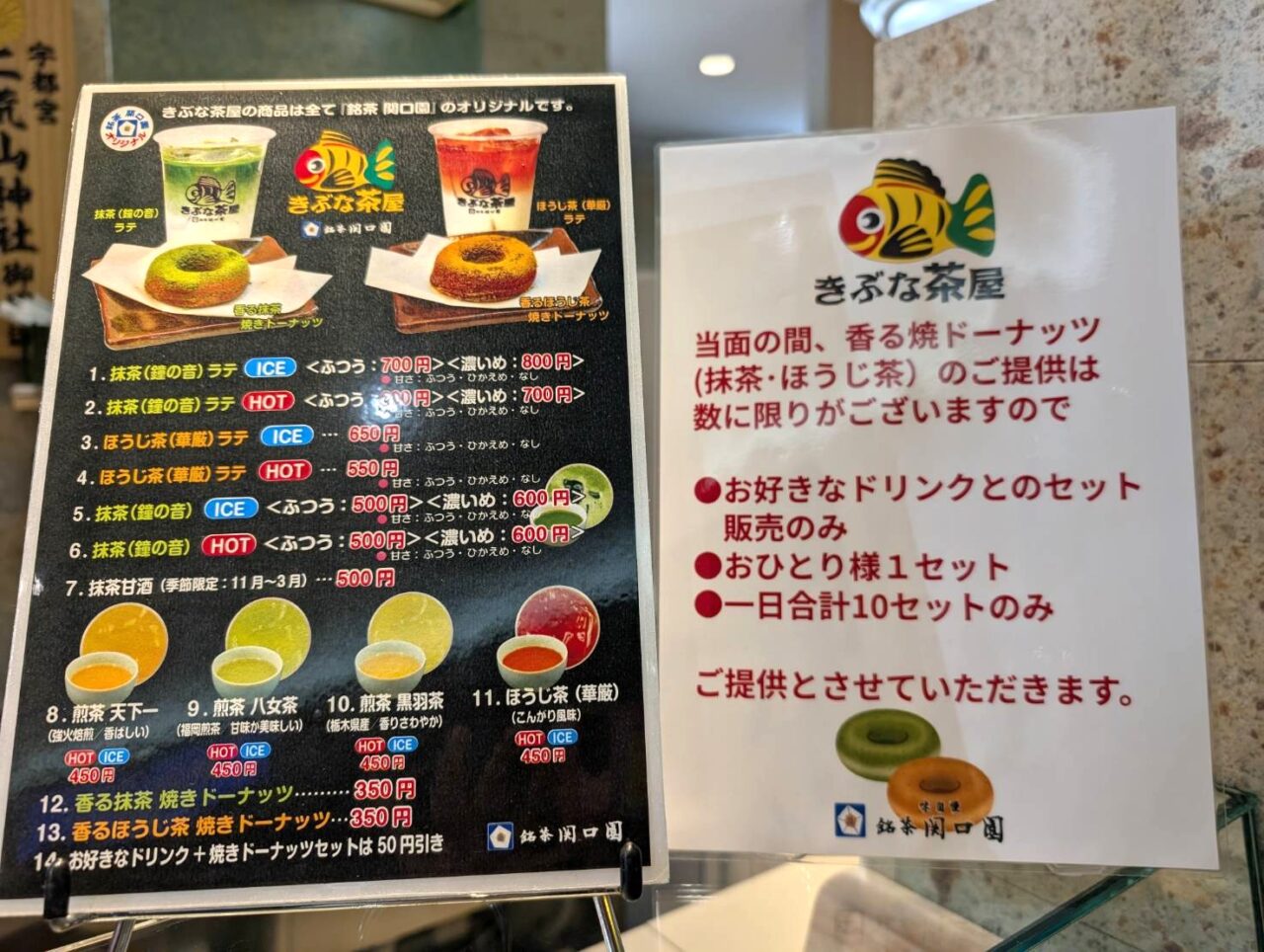 きぶな茶屋の気になるメニューはこちら。お店では、こだわりの厳選茶葉を使ったドリンクと、焼きドーナツを販売。ドリンクは苦さのチョイスができるので、甘い物好きも苦手な方も安心です。