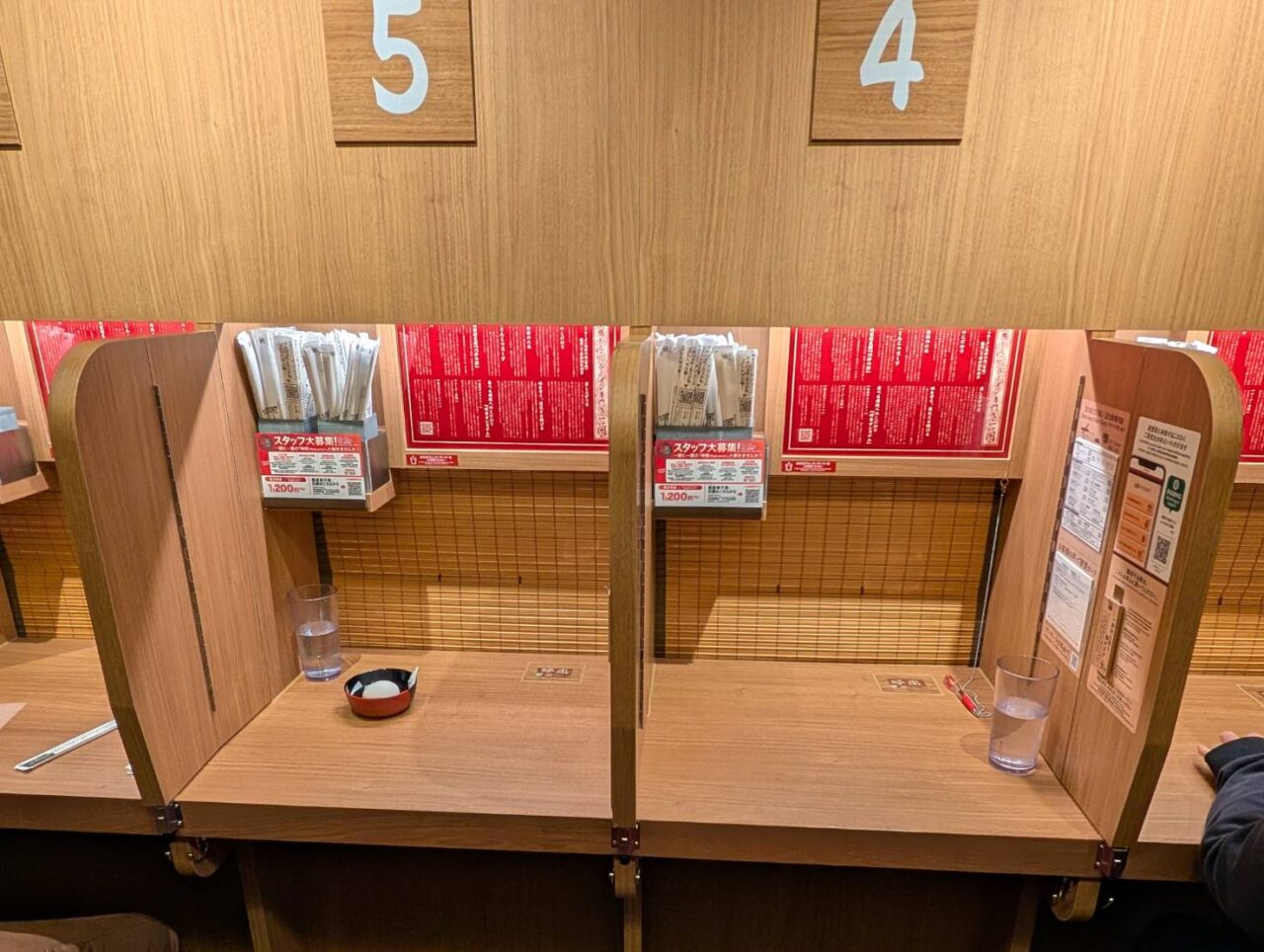 券売機で食券を購入後、一蘭ではお馴染みの、両サイドが仕切られた味集中カウンターに着席。お水はセルフですよ。