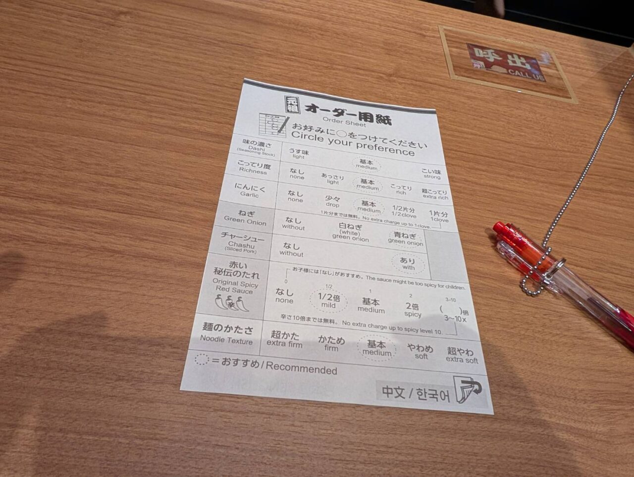 オーダー用紙に好みを印し、呼出ボタンを押して、正面のすだれが開いたら、食券と共にスタッフの方に渡します。細かな注文をしたい時も、誰も待たせることなく、熟考できるのは嬉しい。