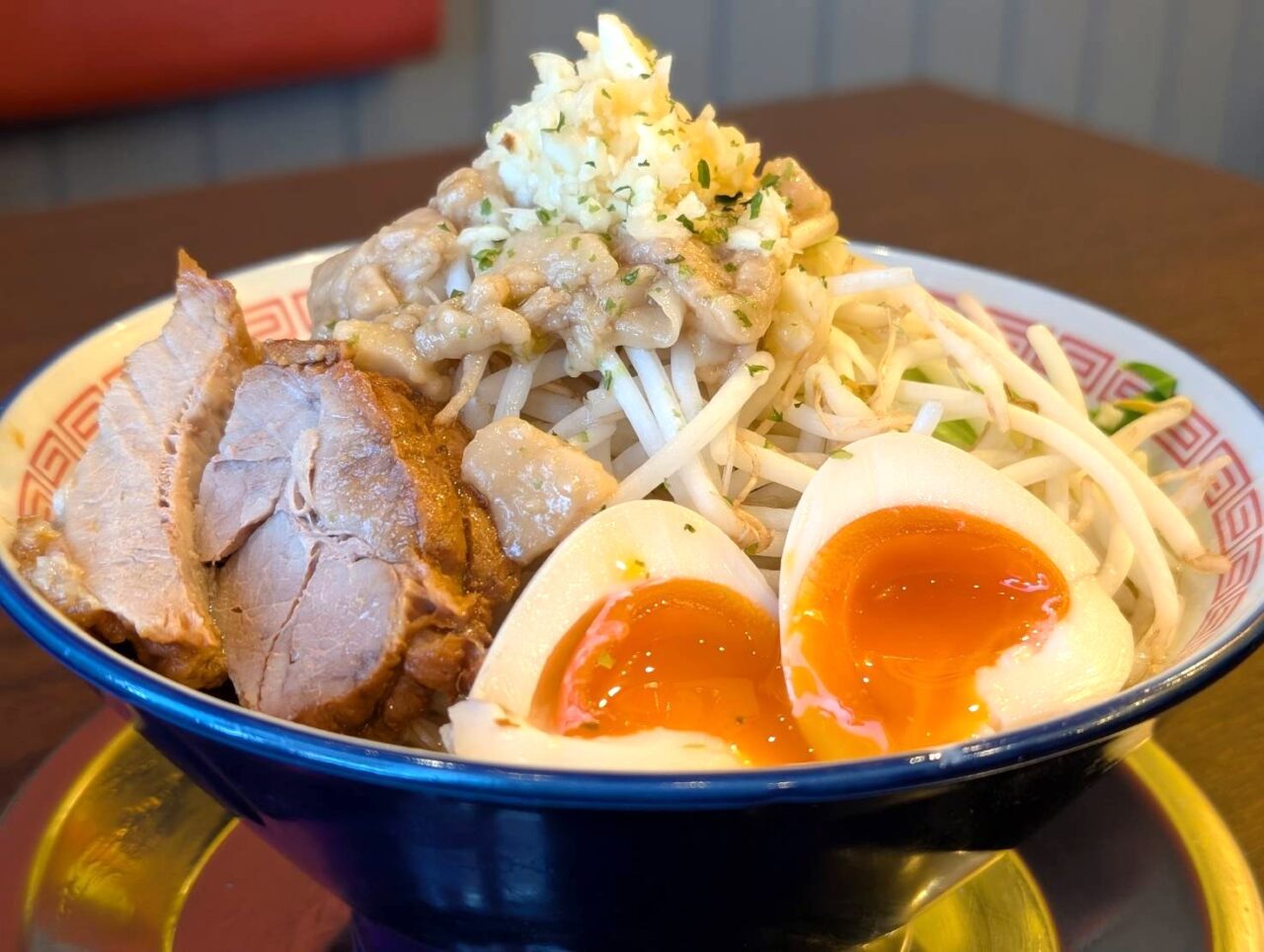 この日、いただいたのは、味噌味玉ラーメン・チャーシュー1枚。ご覧ください、この圧倒的な存在感! シャキシャキなモヤシの山頂には、味付きの背脂と刻みニンニクが鎮座。