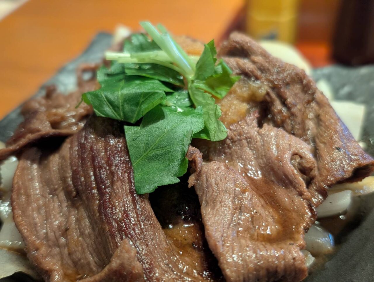 大きなお肉を頬張ると、口いっぱいに濃厚な旨みが広がります。シャキシャキとした玉ねぎの心地よい歯ごたえがアクセントとなり、箸休めにも最適です。