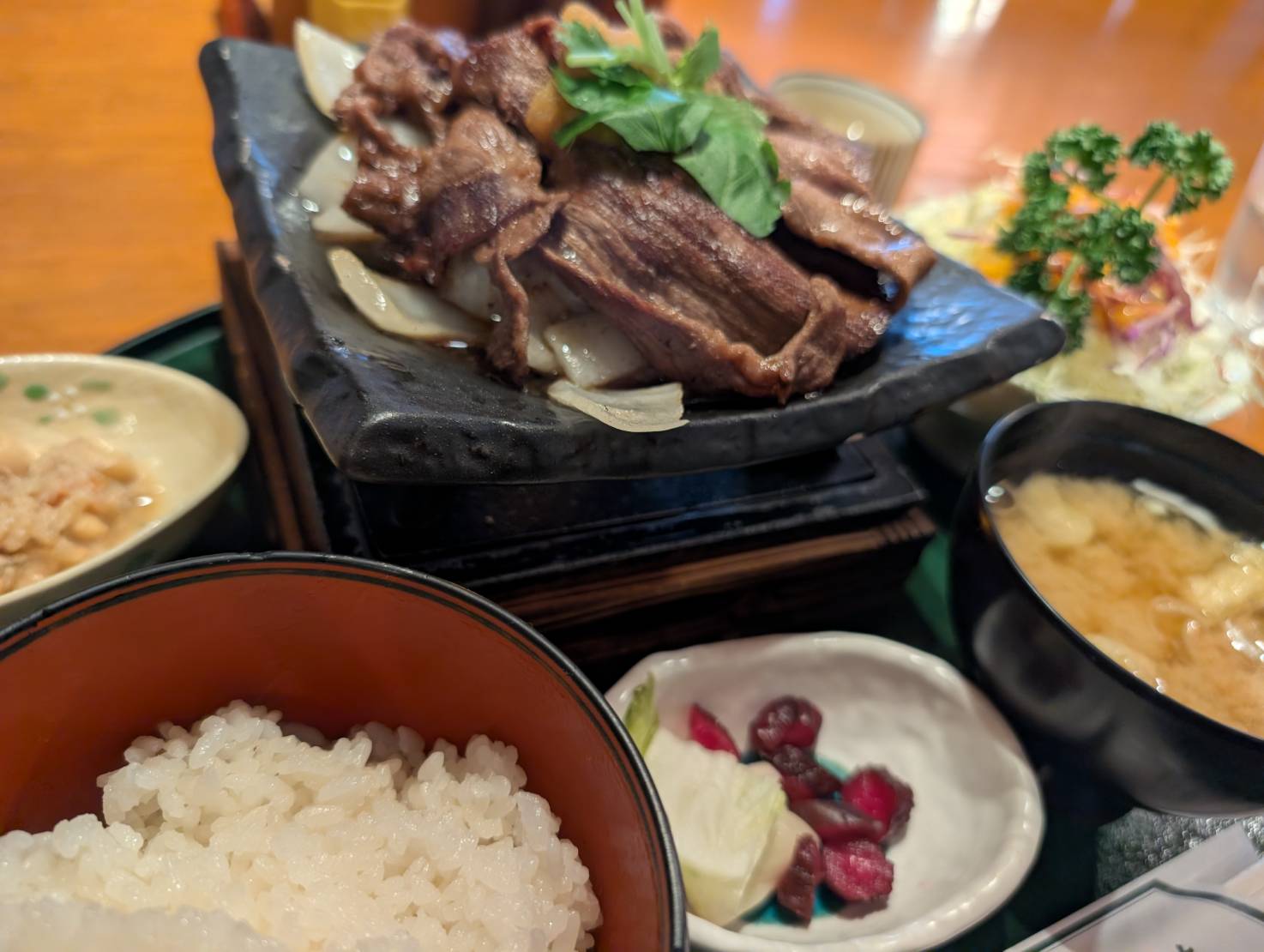 この日、私がいただいたのは牛肉陶板焼きランチ。お肉とサラダ、ごはんにお味噌汁、お漬物。小鉢はなんとしもつかれでした。