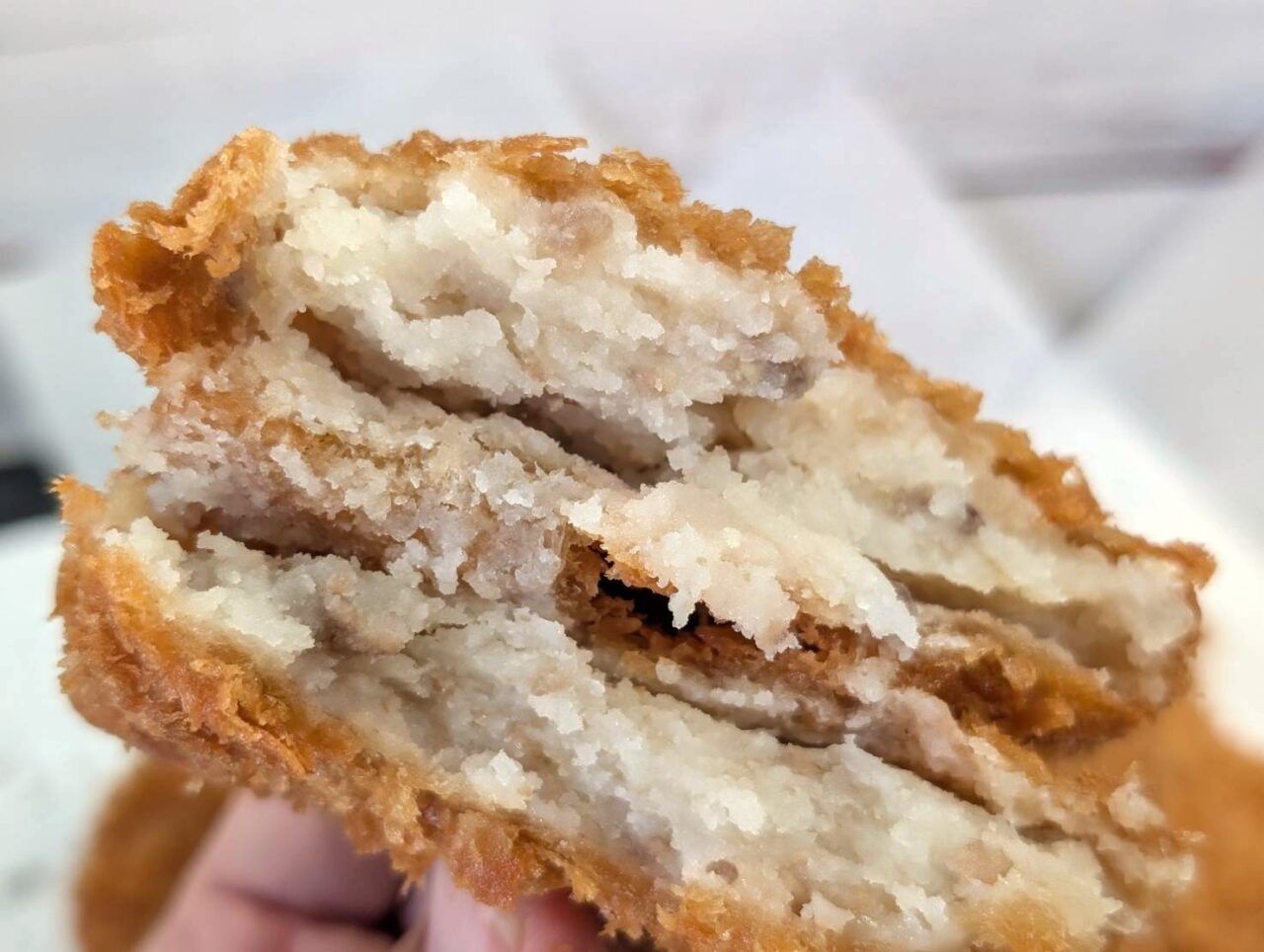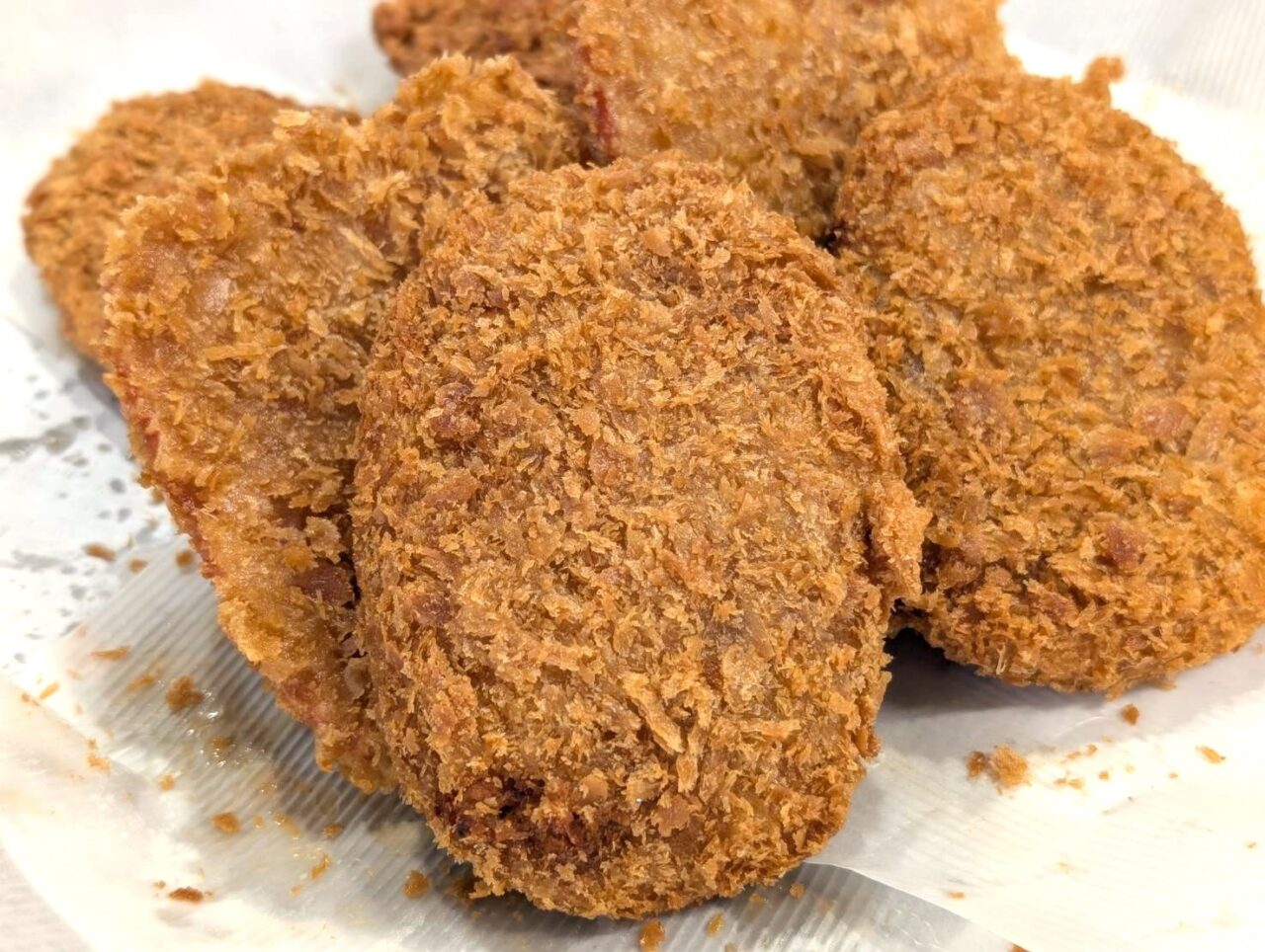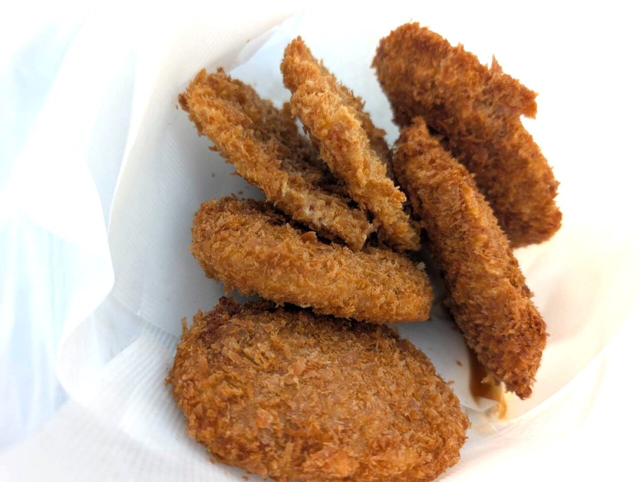 私がこの日いただいたのは、揚げたてのコロッケ、メンチ、ハムカツ。袋から立ちのぼる熱と香ばしい匂いが猛烈に食欲を刺激。思わず頬がゆるみます。