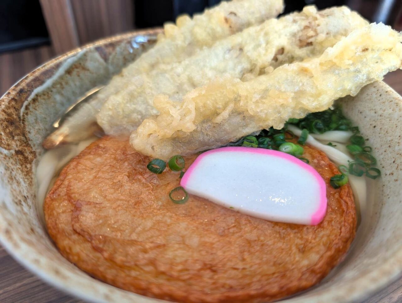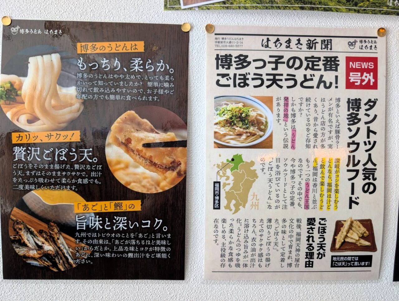 この日、私がいただいたのは、一番人気の博多丸天・ごぼう天うどん。大きな丸天と、別添えでこちらも大きなごぼうの天ぷらが3本ついてきます。