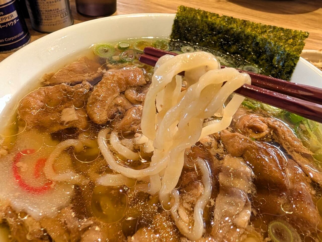麺は佐野の製麺所から直送。手打ちならではの不揃いさがあり、つるっと、もちっと力強い食感。ちぢれた中太麺がスープをほどよく持ち上げ、相性の良さを存分に感じられます。