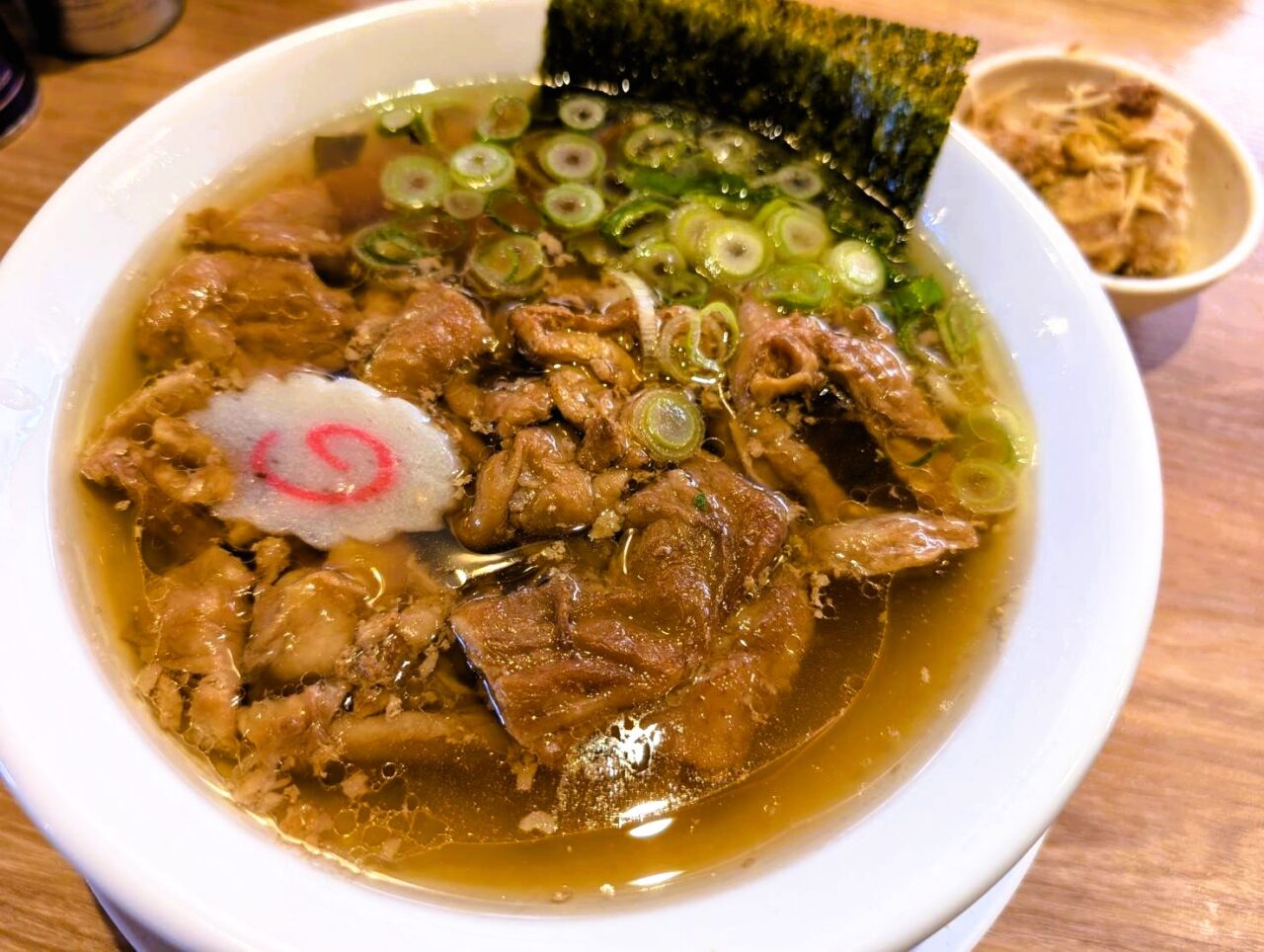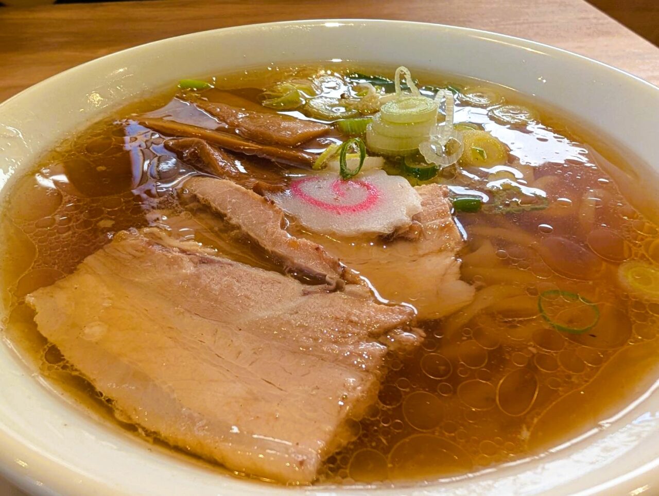 醤油ラーメンは、シンプルながら大きなチャーシューが贅沢に二枚。透明感のあるスープは見た目以上にコクがあり、しっかり濃いめの味わい。それでいて、最後の一口まで飽きずに楽しめる美味しさです。