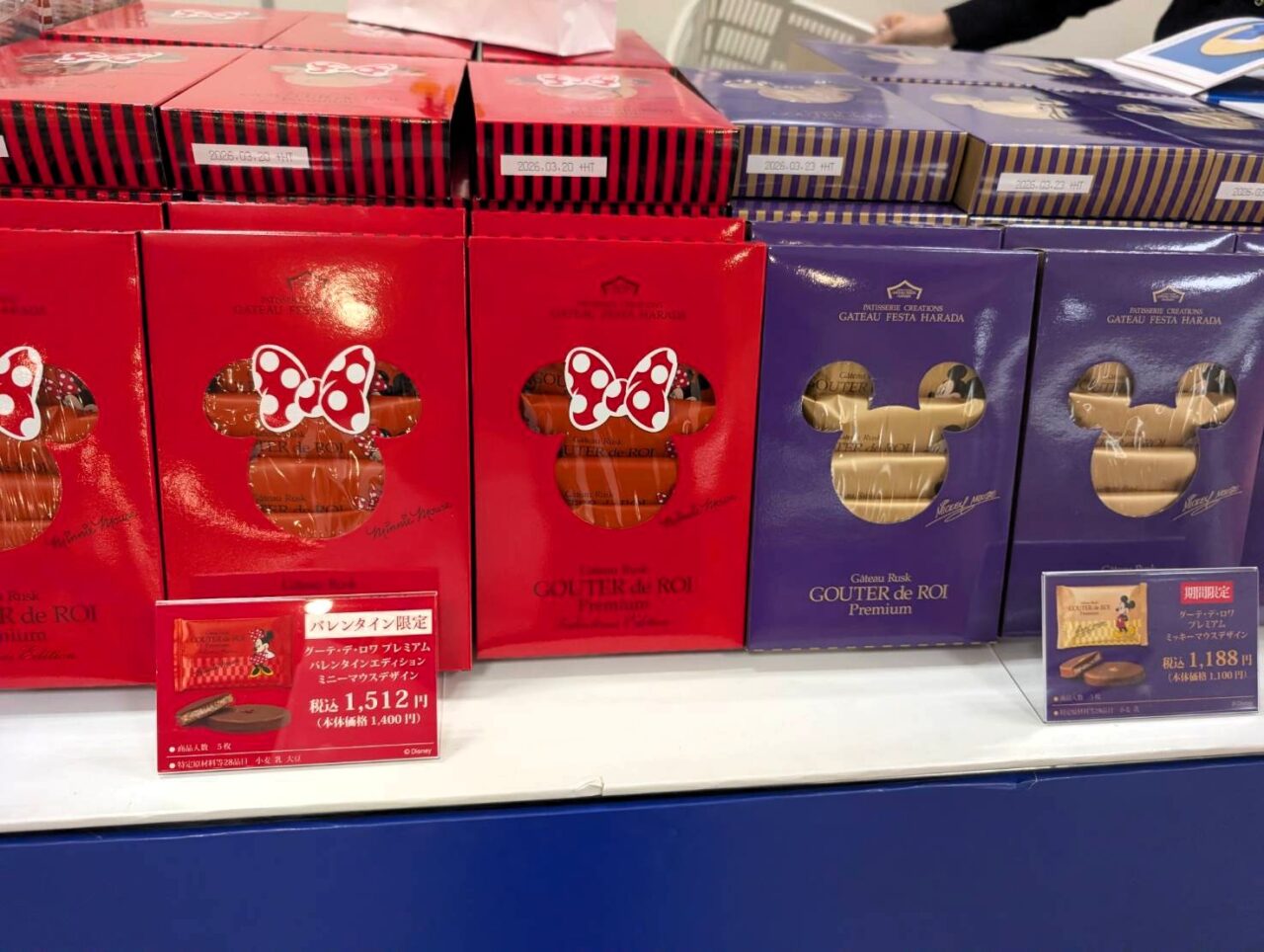 こちらはバレンタイン限定パッケージのグーテ・デ・ロワ プレミアム バレンタインエディション ミニーマウスデザイン(赤)とミッキーマウスデザイン(青)。キュートなミッキーとミニーは、バレンタインにはもちろん、ギフトや自分へのご褒美にもぴったり。