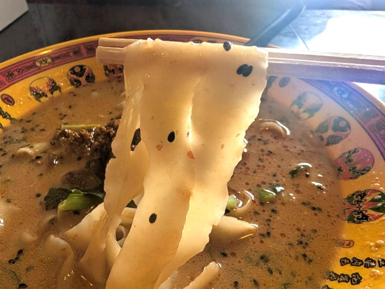 麺は、生地を刀で削り出すことで生まれる不揃いな太さが特徴。もちもちとした食感で、スープがよく絡み、旨みを存分に楽しめます。