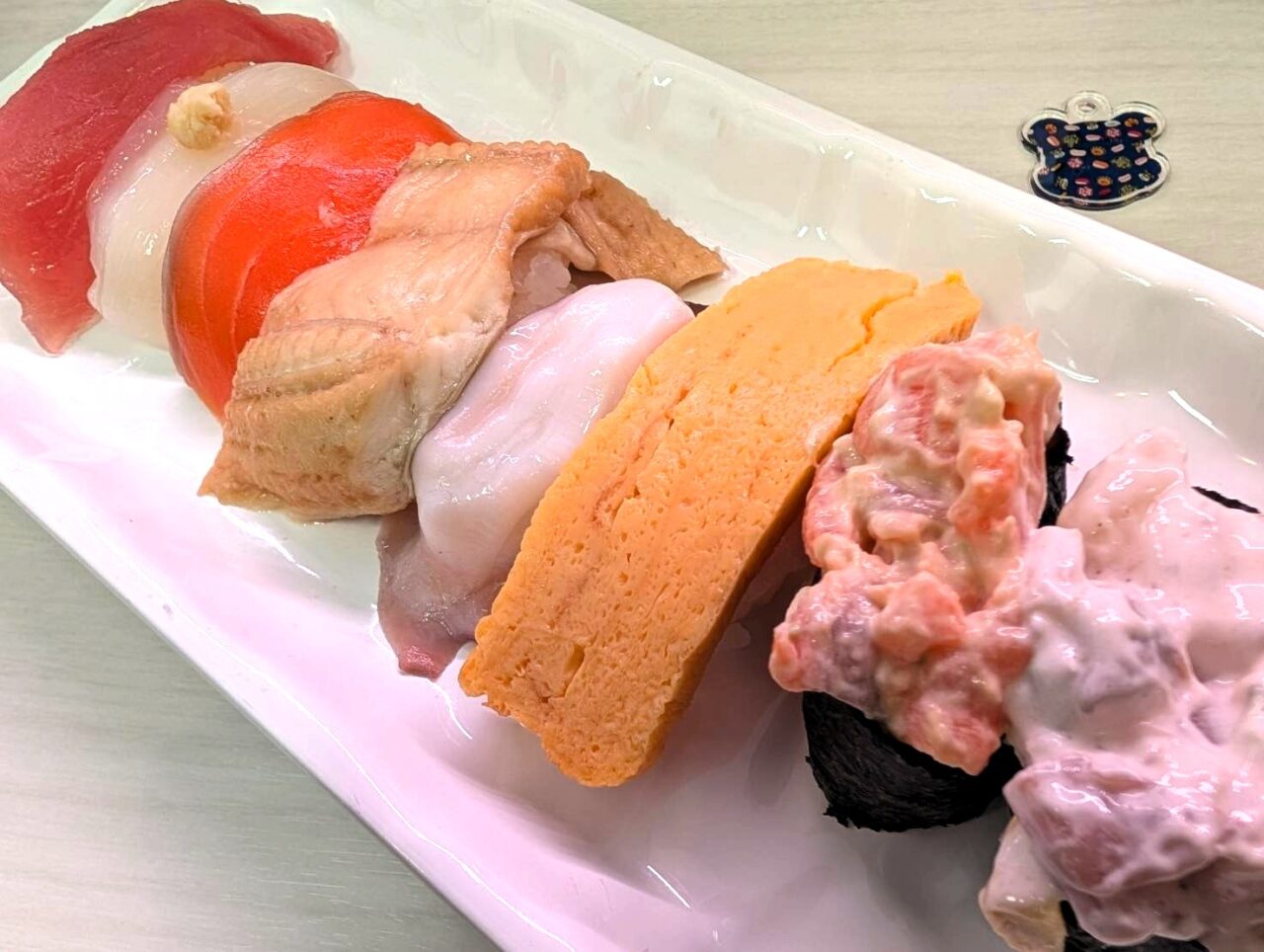 選手厳選のネタは大切りまぐろ、いか山わさびのせ、サーモン、ふわとろあなご、たこ、たまご、サーモンアボカドぐんかん、シーフードサラダの全8貫。誰もが納得の定番ネタから、意外なネタまで、大満足の一皿です。