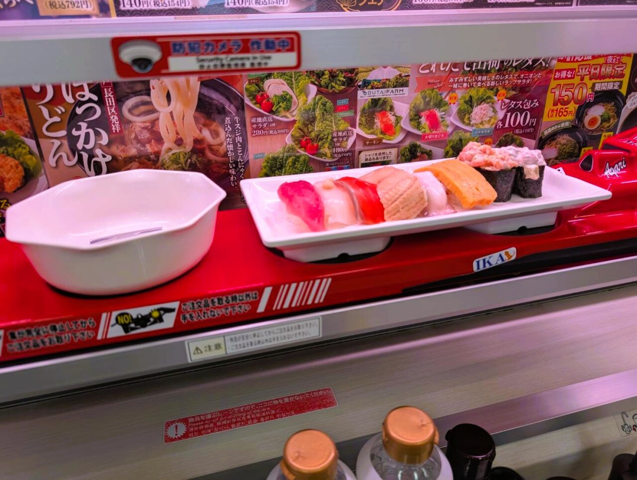 タブレットで注文すると、お馴染みの高速レーンにて運ばれてきます。アクリルキーホルダーは器の中にありました。