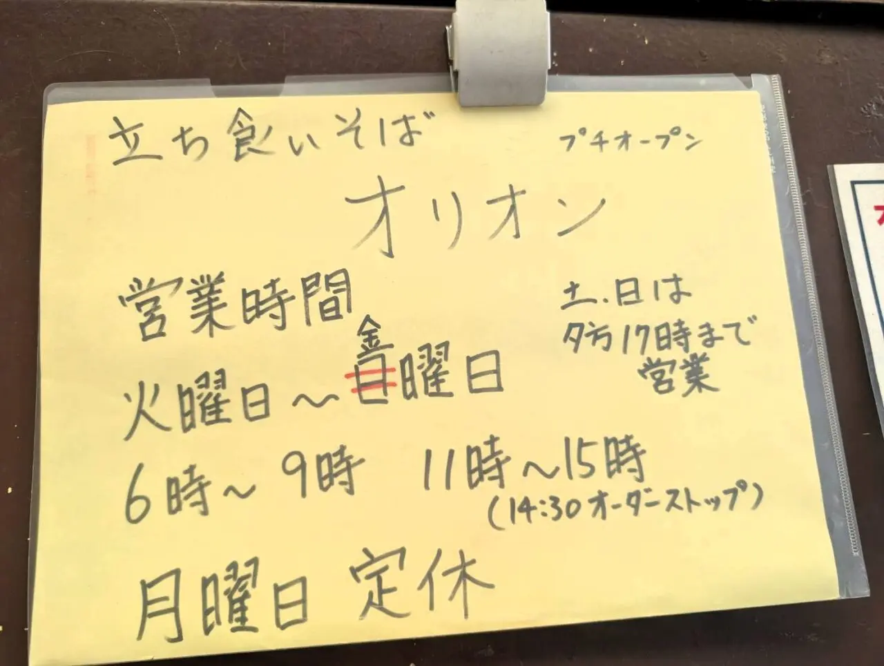 次回はオープン時間におじゃまし、お店の様子やお味をお伝え致しますのでお楽しみに。オリオン通りに現れたのは、いそがしいあなたの強い味方。立ち食いそばオリオンへぜひどうぞ。