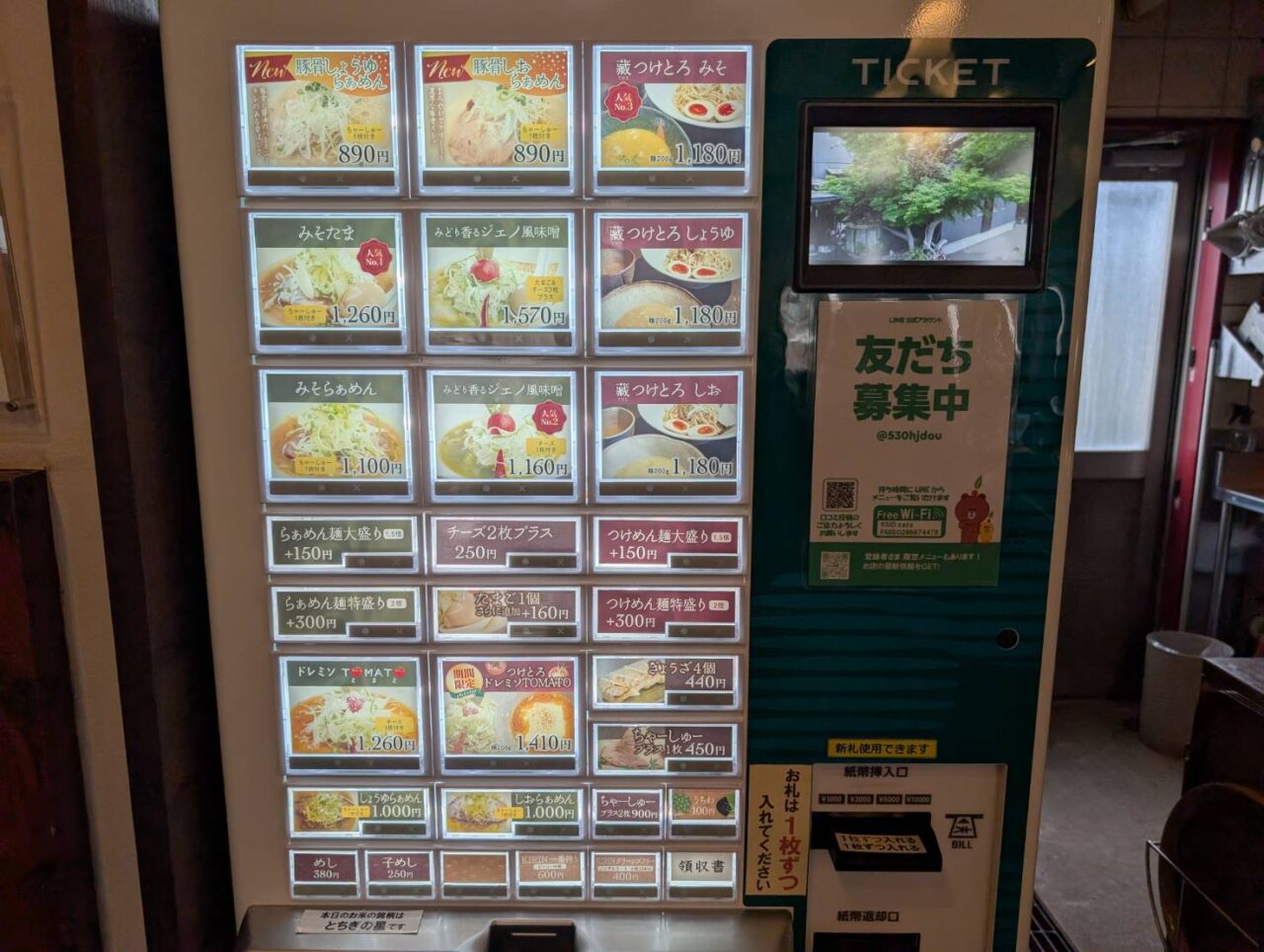 お店の方に呼ばれてから入店。券売機で食券を購入し、スタッフに渡します。お席は案内された席へどうぞ。