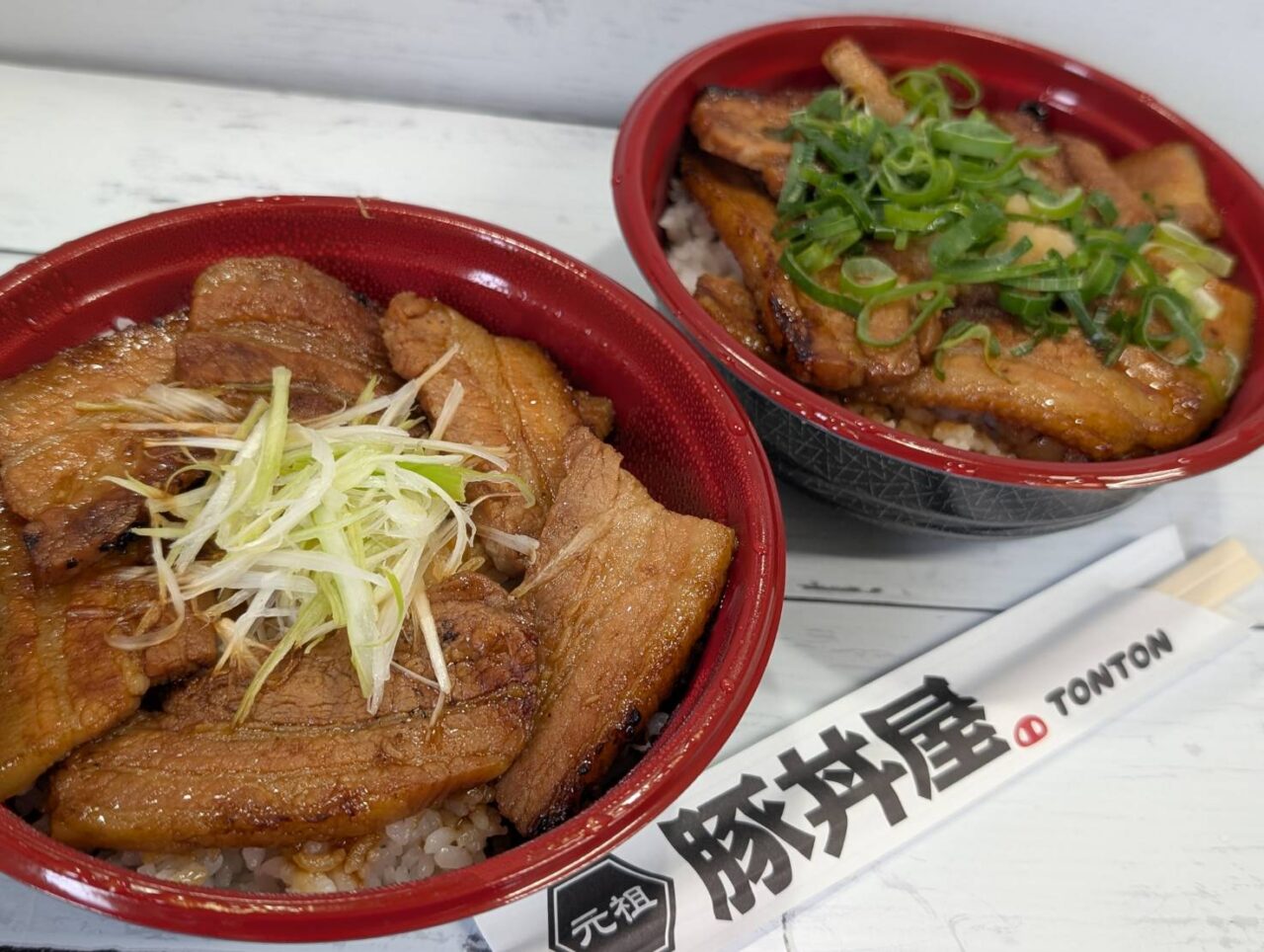 この日テイクアウトで購入したのはこちらの豚丼(左)と、おろしポン酢豚丼(右)。どちらも量は並です。