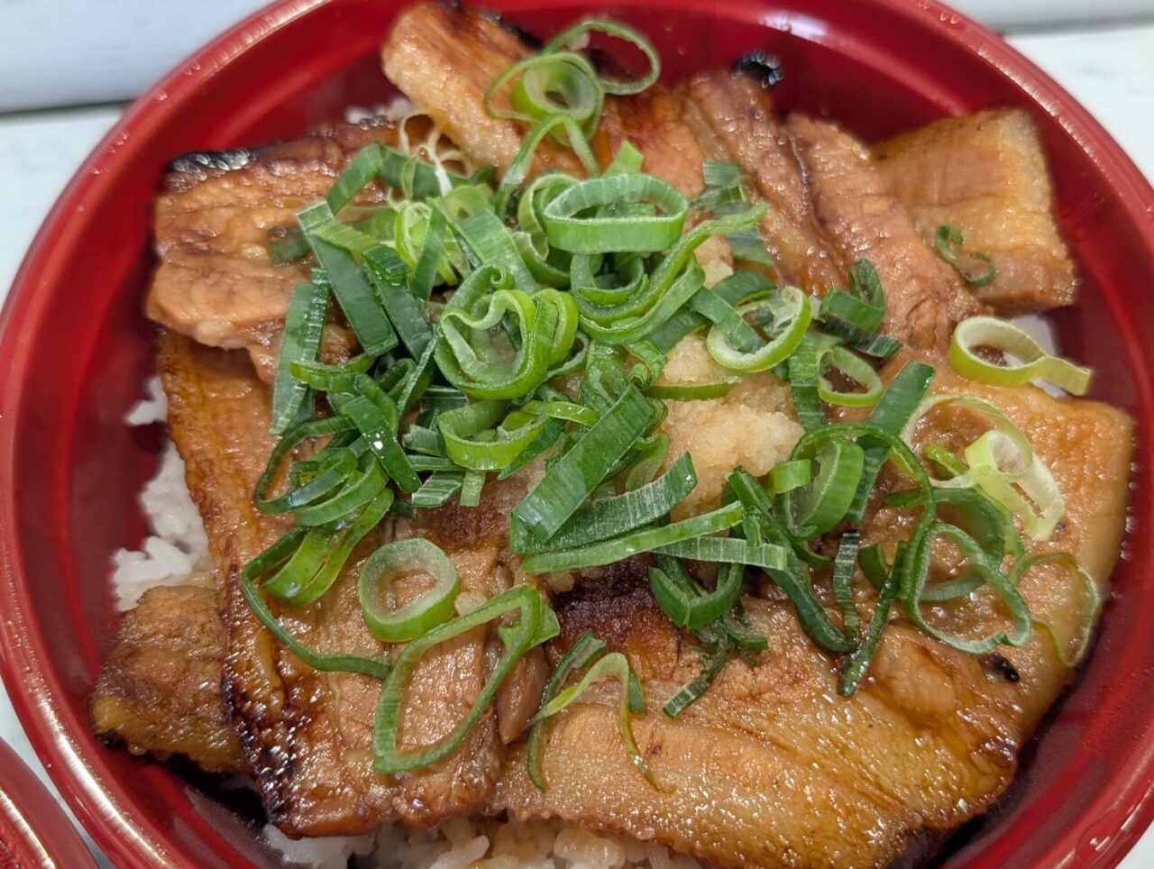 まずは王道の豚丼。香ばしい豚肉に甘辛ダレが絡み、ご飯が進む美味しさ。脂のコクはありつつ、白髪ねぎで後味はさっぱり。シンプルながら満足度の高い一杯。