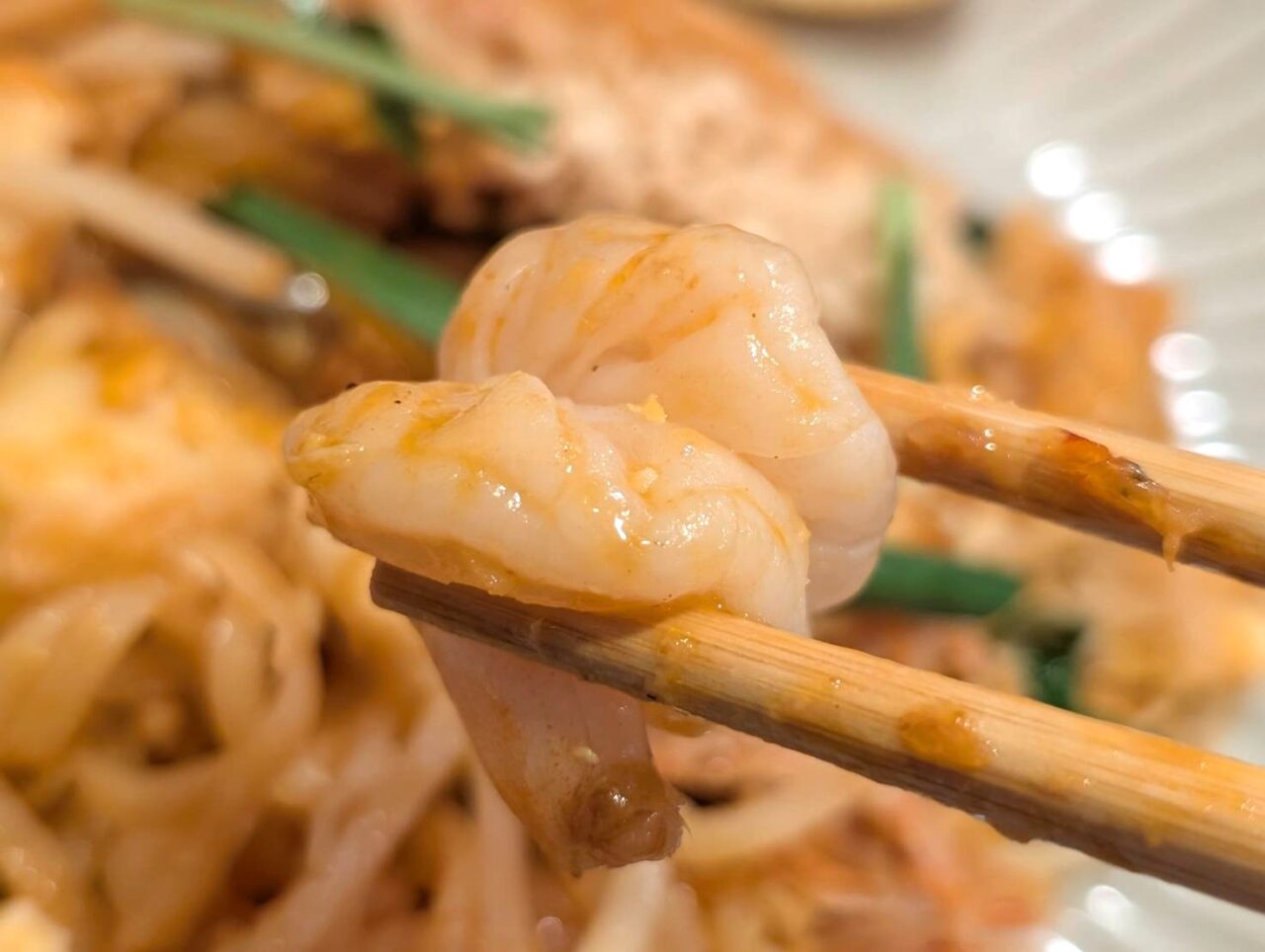 パッタイは具沢山で食べ応え抜群! プリプリのエビに、味が染みた厚揚げ、そして細かく刻まれた、タイのたくあんのコリコリ食感が絶妙なアクセント。 甘みと塩気のバランスが完璧で、まさにここでしか味わえない本場のクオリティに大満足でした。