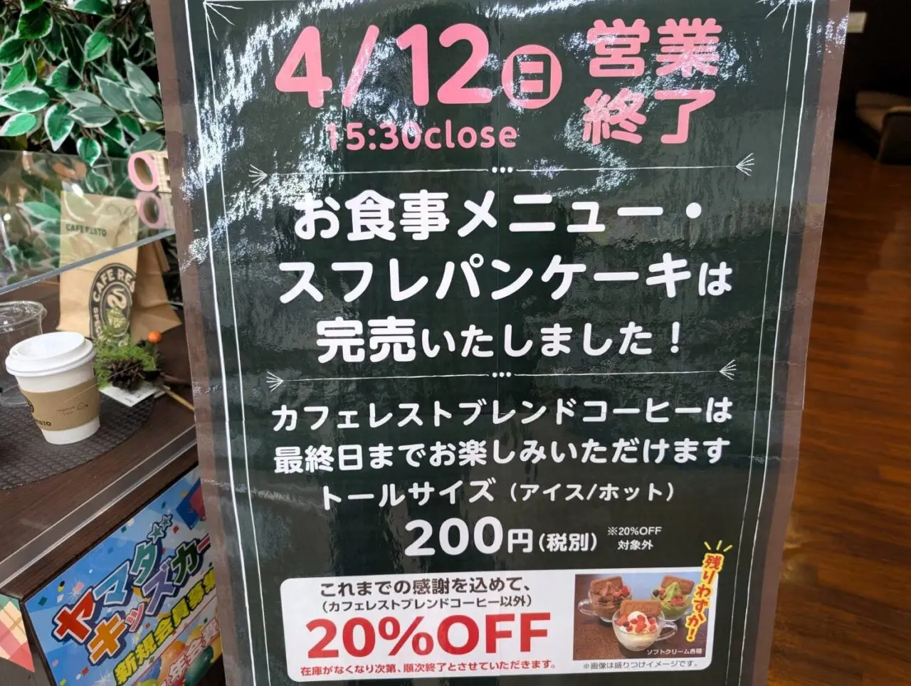 閉店にともない、ただいま20%オフ中。ただし、私が伺った4月7日(火)時点で、すでにお食事メニューとスフレパンケーキは完売していました。