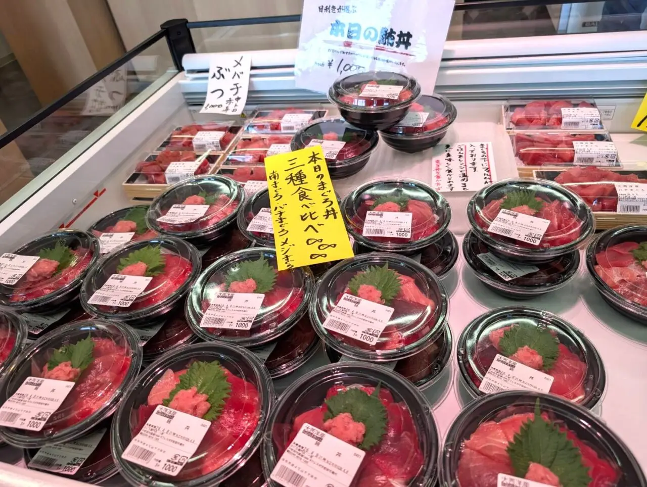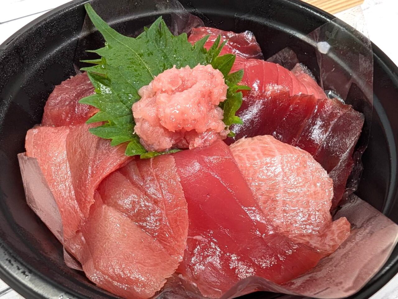「三種食べ比べ丼」は、南まぐろ・バチまぐろ・メジまぐろを一度に味わえる贅沢さ。これだけ鮮やかなマグロがぎっしり詰まって1,000円(税込)という、専門店ならではの衝撃的なコストパフォーマンスです。