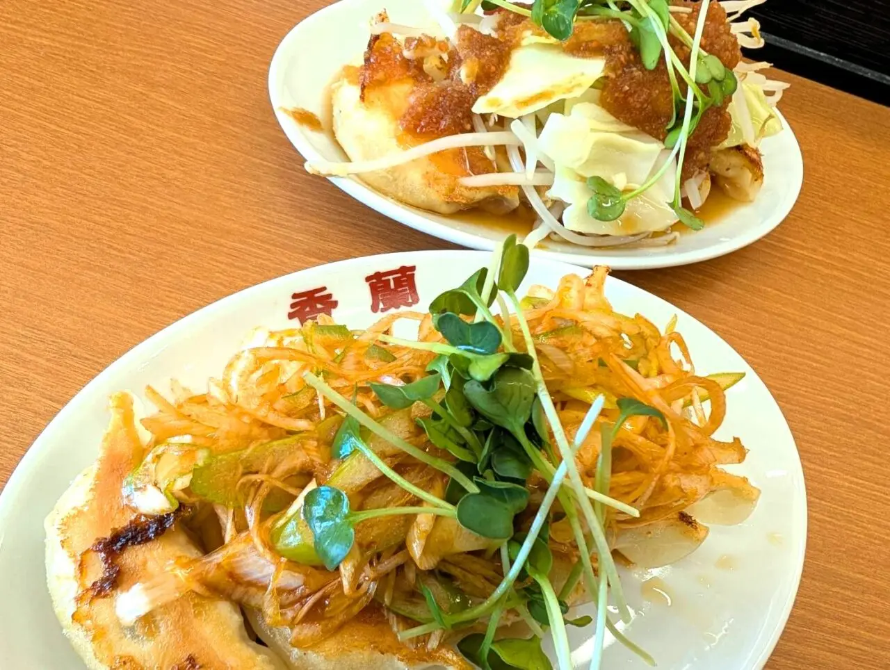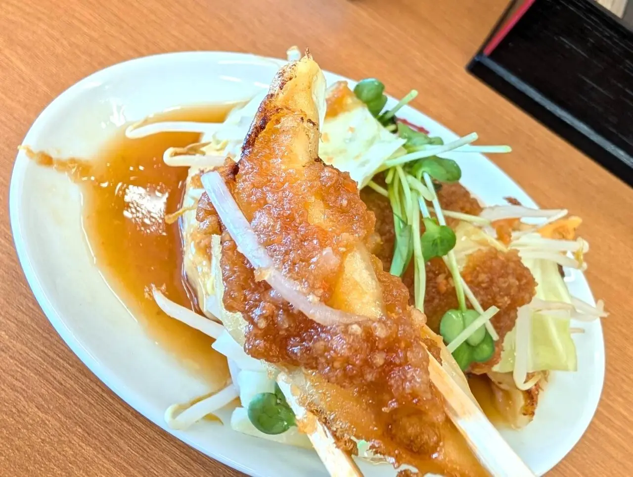 オニオンソース餃子は、たっぷりの玉ねぎソースに、もやしやキャベツなどの野菜が添えられた一皿。濃厚ながら玉ねぎの甘みが活きたソースが、香蘭のモチモチ皮にしっかり絡みます。野菜と一緒に食べることで、ボリュームがありつつもさっぱりと楽しめます。
