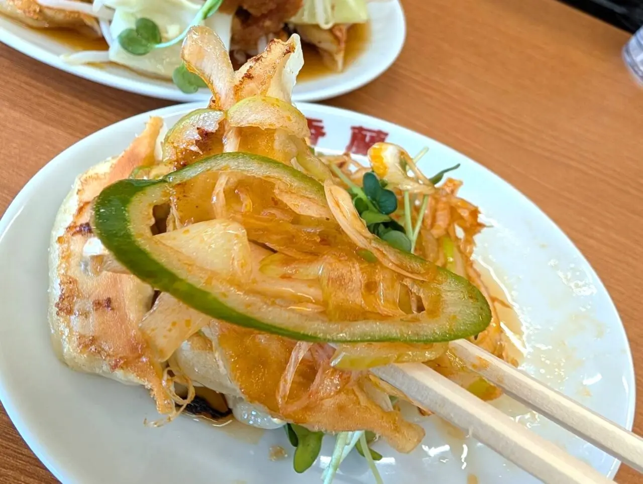 こちらが、ピリ辛ネギ餃子(手前)とオニオンソース餃子(奥)。どちらも焼と茹から選べますが、私は両方焼でいただきました。